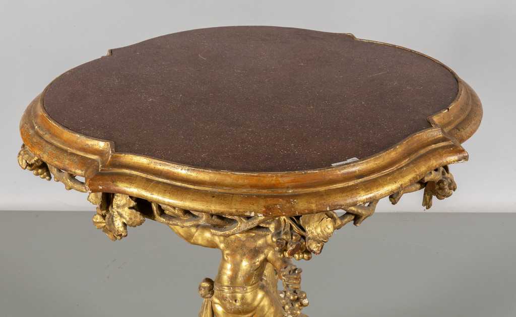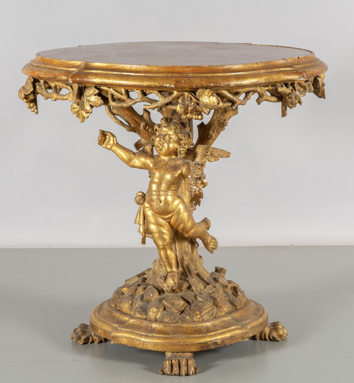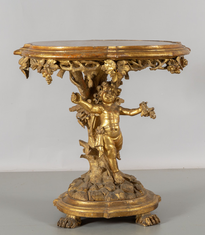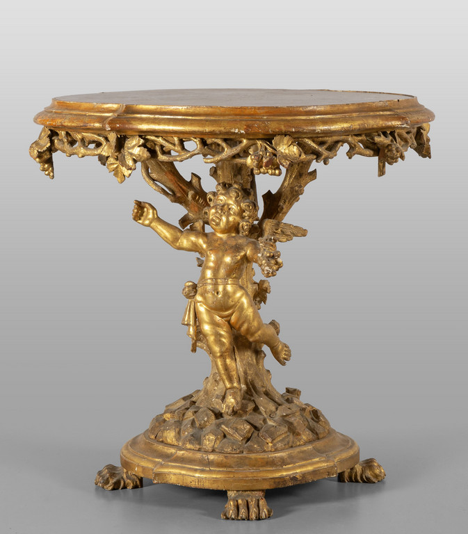 Tavolo da centro in legno intagliato e dorato con putti e tralci di vite inizi sec.XIX