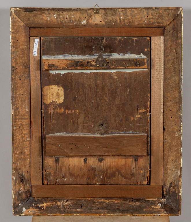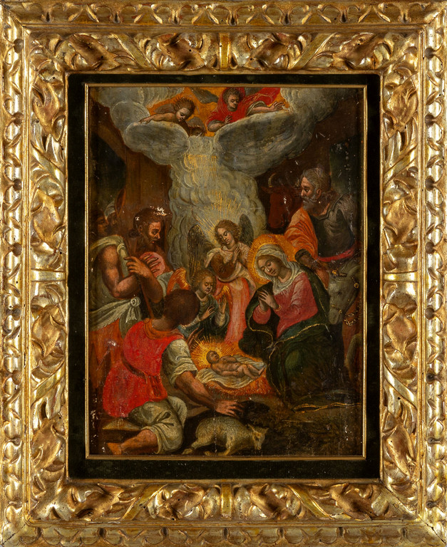 Scuola dalmata sec.XVII 'Adorazione del Bambino' olio su tavola cornice coeva in legno intagliato e dorato