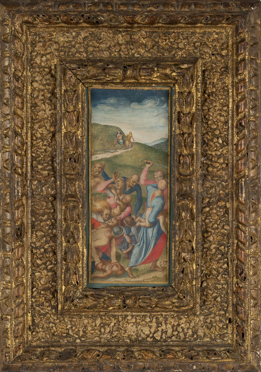 'La strage degli Innocenti' tempera su pergamena sec.XVII bella cornice coeva in legno finemente intagliato e dorato