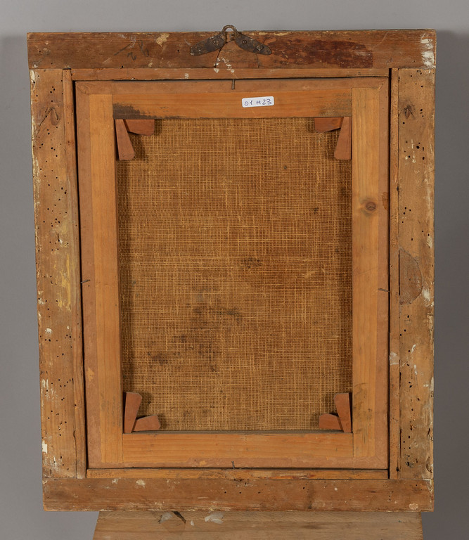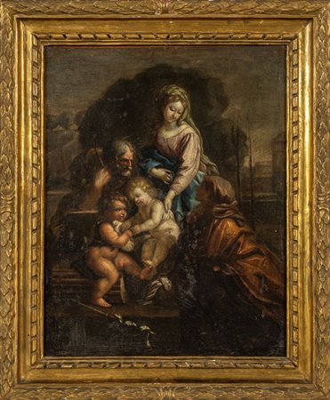 Scuola italiana sec.XVIII 'Sacra Famiglia con San Giovannino' olio cornice coeva in legno intagliato e dorato