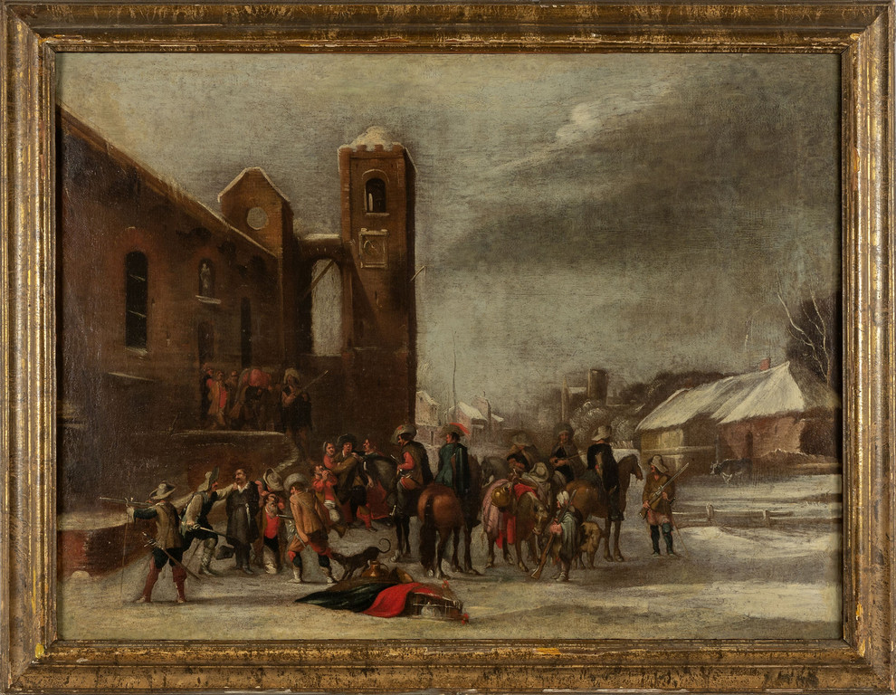 Scuola fiamminga sec.XVII 'Assalto all'Abbazia sotto la neve' olio