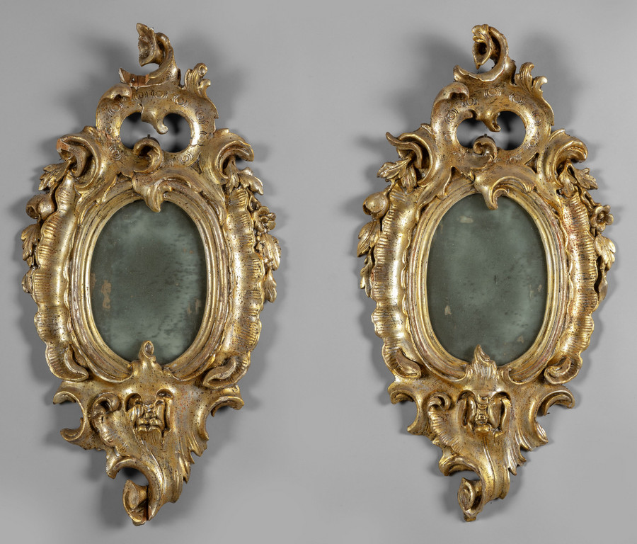 Coppia di apliques Luigi XIV in legno intagliato e dorato a mecca Italia Meridionale sec.XVIII