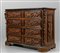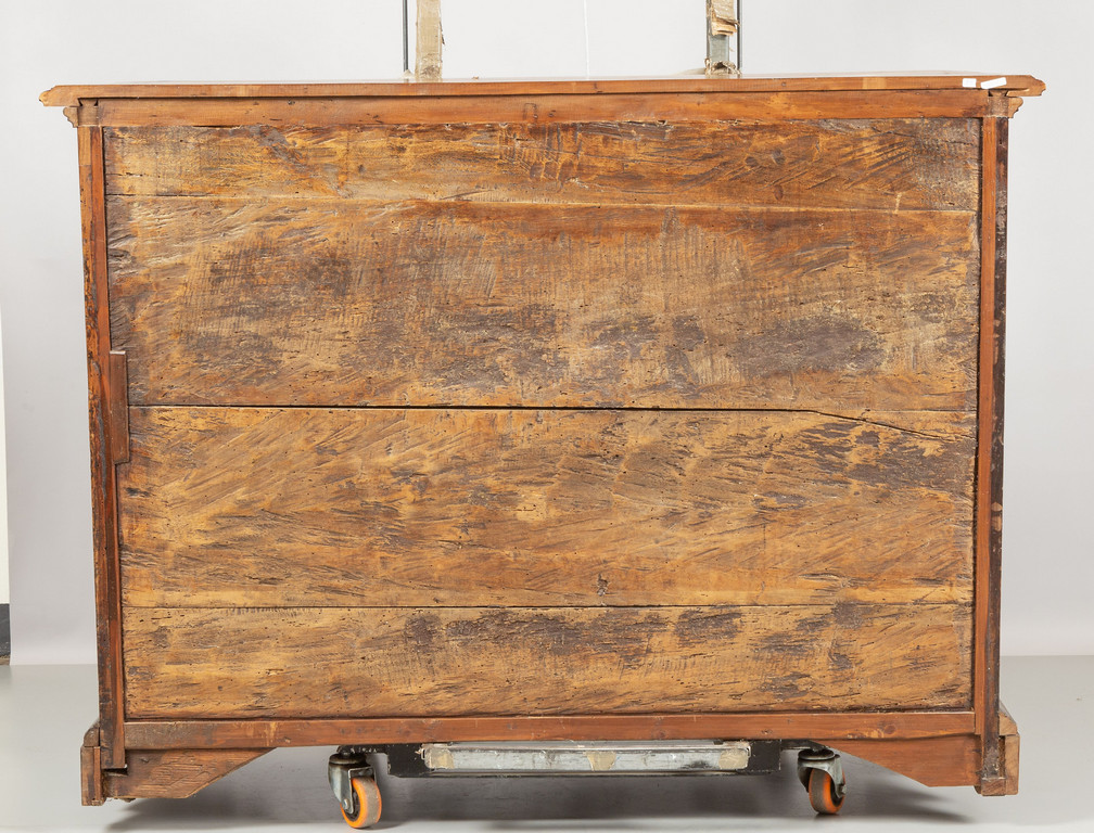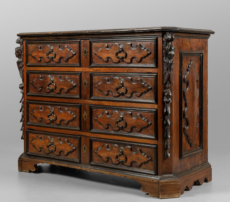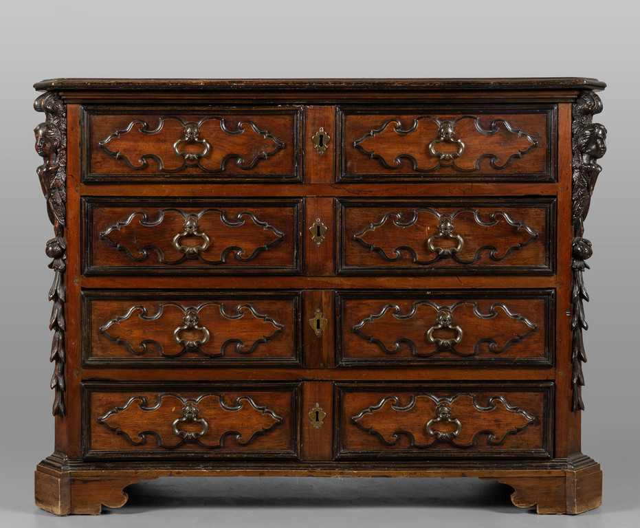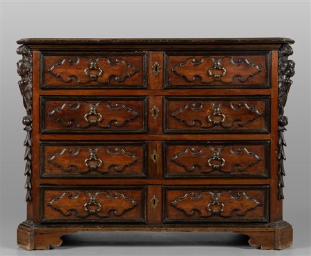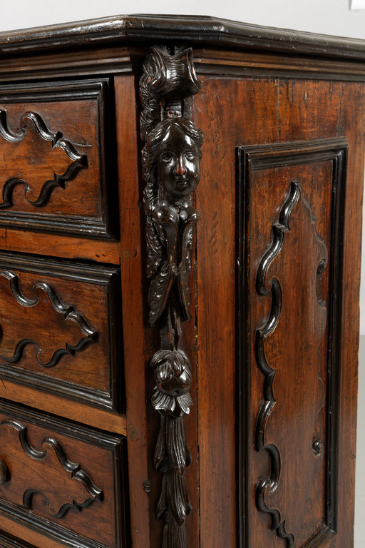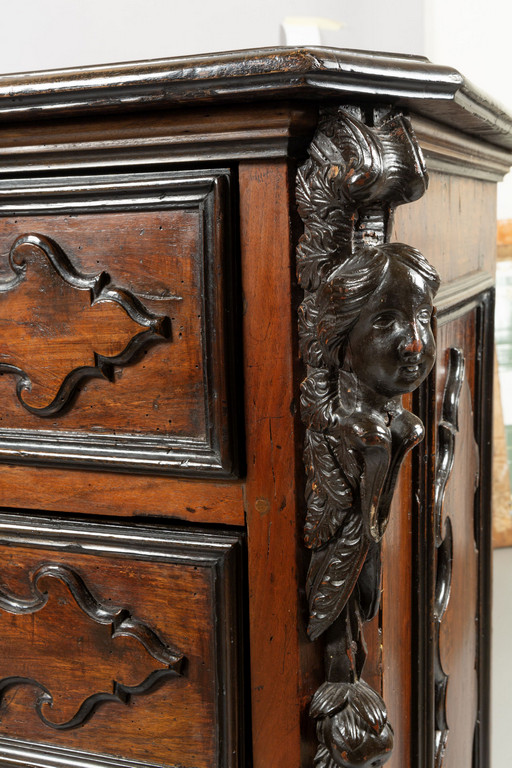Canterano in noce a quattro cassetti montanti scantonati ed intagliati con angeli primo cassetto a scrittoio ribaltabile Lombardia sec.XVIII