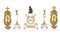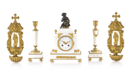 PENDOLA DA TAVOLO E COPPIA DI CANDELIERI IN MARMO BIANCO E METALLO DORATO, FINE XIX SECOLO, cassa a plinto cimata da putto e semicolonne laterali; mancanze e difetti, uniti a COPPIA DI ACQUASANTIERE IN BRONZO DORATO, XX SECOLO, centrate da Madonna con Bambino.