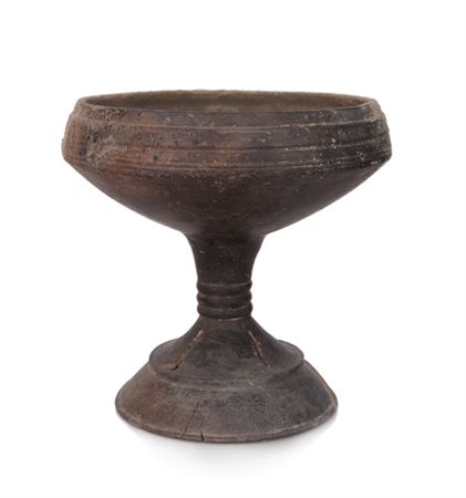 CALICE CORINZIO IN BUCCHERO COLOR BRUNO, VII SECOLO A.C., a coppa su piede conico e base circolare, superficie con scanalature, costolature ad anelli e decoro con striature di settori a traforo; restauri.