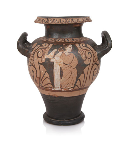 STAMNOS A FIGURE ROSSE IN ARGILLA FIGULINA, ETRURIA, CERVETERI, IV SEC. A.C., ovoidale rastremato su piede ad anello, anse a bastoncino e collo svasato, decoro con figure con giovane donna con colomba e uomo con collana seduto su roccia; lievi usure.