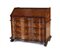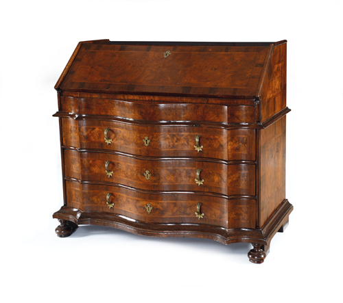 CASSETTONE CON RIBALTA LASTRONATO IN RADICA DI NOCE, VENETO, META' XVIII SECOLO, fronte mosso a linee curve e spezzate con tre cassetti e bordi centinati, calatoia celante due tiretti e tre vani a giorno di cui uno con piano scorrevole celante segreti, decori a filettature formanti cornici; reca scritta interna con data "1755"; piedi anteriori di epoca successiva, restauri minimi.