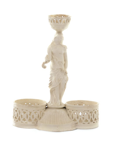 PORTA AMPOLLE IN TERRAGLIA, ESTE, INIZIO XIX SECOLO, sostegno a figura reggente cornucopia cimata da cesto, doppia vasca traforata e doppia saliera a conchiglia.