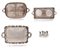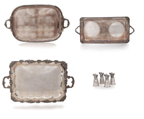 QUATTRO BICCHIERI DA CACCIA, GUCCI, E TRE VASSOI IN METALLO ARGENTATO, XX SECOLO, vassoi a due manici con decori incisi e bicchieri a foggia di cinghiale; usure.