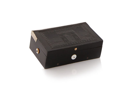 SCATOLA IN TARTARUGA CON CARILLON, FRANCIA, XIX SECOLO, rettangolare con decoro a rilievo con vedute dell'arco di Trionfo; sbeccature e lievi ammaccature.