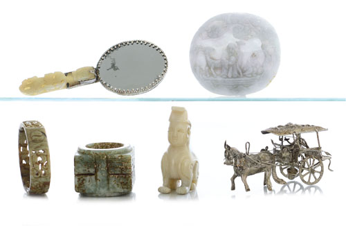 LOTTO DI DIVERSI OGGETTI E SCULTURE, CINA, XIX-XX SECOLO, composto da un bracciale, un calamaio, una sfinge e una placca in in pietra dura, uno specchietto con presa e placca in giadeite intagliata e un calesse in argento non punzonato; difetti.