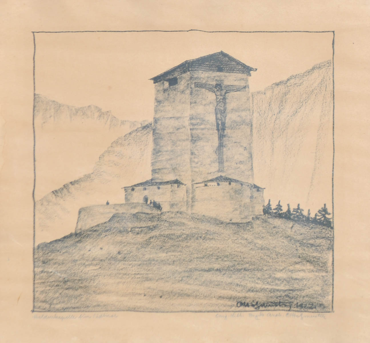 Clemens Holzmeister (Fulpmes, Stubital 1885 - Hallein 1983) Cappella dellsEroe per il Sudtirolo, 1922;Litografia, 48,5 x 48,5 cm, foro piccolo, incorniciata