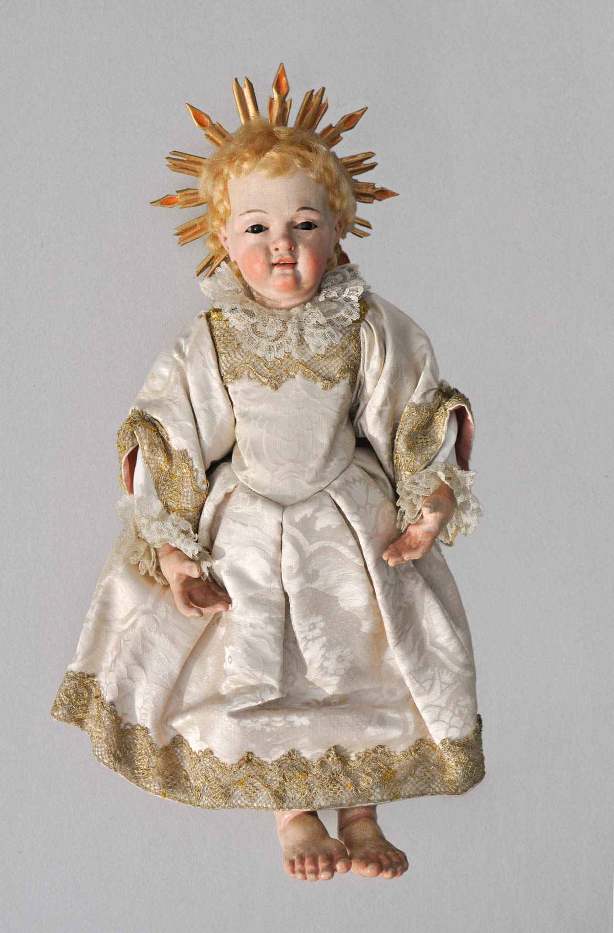 Anonym/Anonimo Gesy bambino, primo XIX sec.;Legno dipinto, occhi di vetro, vestito di seta,