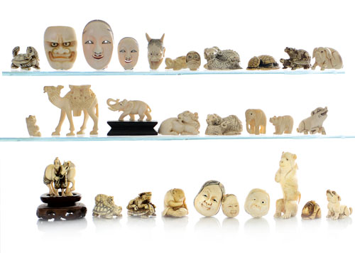 LOTTO DI DIVERSE SCULTURE IN AVORIO E OSSO, XX SECOLO, composto da otto maschere e ventuno netsuke-okimono con fogge di animali; sbeccature.