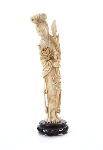 SCULTURA IN AVORIO, CINA, INIZIO XX SECOLO, raffigurante una lady con ventaglio e fiore in mano, base in legno.