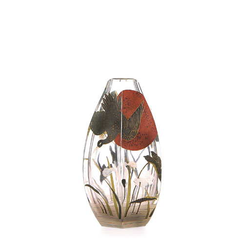 VASO IN CRISTALLO DECORATO A SMALTI, L'ESCALIER DE CRISTAL PARIS, 1930 CA., a sezione esagonale con decoro a paesaggio acquatico con piante e volatile ripreso in oro, firma in oro sul fondo "Escalier de Cristal Paris".