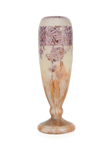 VASO IN VETRO DOPPIO, LE VERRE FRANCAIS, 1927 CA., a balaustro, decoro a fiori stilizzati viola su fondo maculato, doppia firma incisa "Le Verre Français" e a cammeo "Carder".