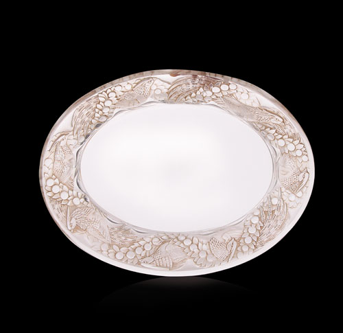JARDINIERE "FAISANS" IN VETRO, R.LALIQUE, 1940 CA., ovale pressata in forma con bordo a fagiani e foglie, firma incisa "R.Lalique France".