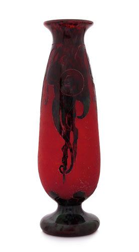 VASO IN VETRO DOPPIO, LE VERRE FRANCAIS, 1924 CA., decoro "Prune" a frutti e foglie di inciso ad acido nei toni del rosso e bruno su fondo rosato, firma incisa alla punta "Le Verre Francais".