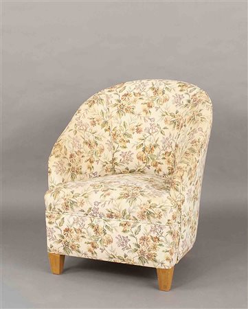 Poltroncina a gondola interamente rivestita in tessuto, poggiante su gambe in faggio, vecchia manifattura, h. cm. 78.