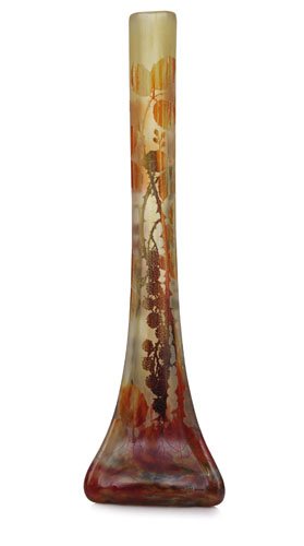 VASO IN VETRO DOPPIO, DAUM NANCY, 1910 CA., a sezione triangolare con decoro a rami con more e foglie nei toni del bruno e arancio inciso ad acido su fondo striato, firma in rilievo a cammeo "Daum Nancy" con croce di Lorena.