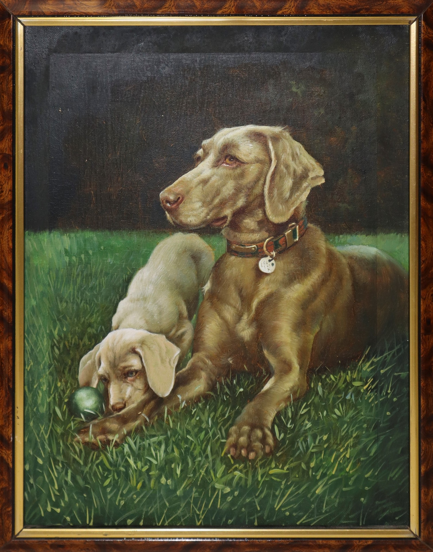 Coppia di cani, 20° secolo painter cm 40x31; in cornice cm 54x44 olio su tela