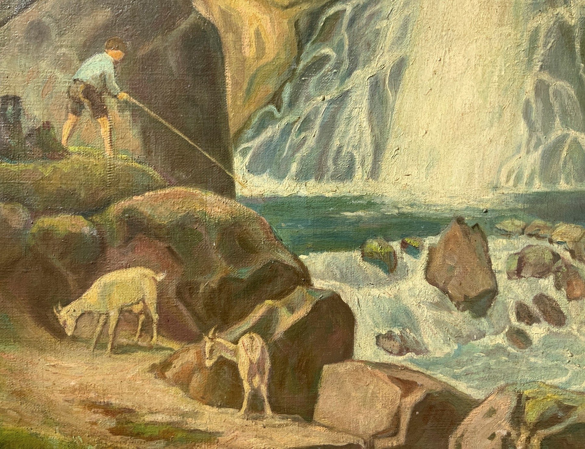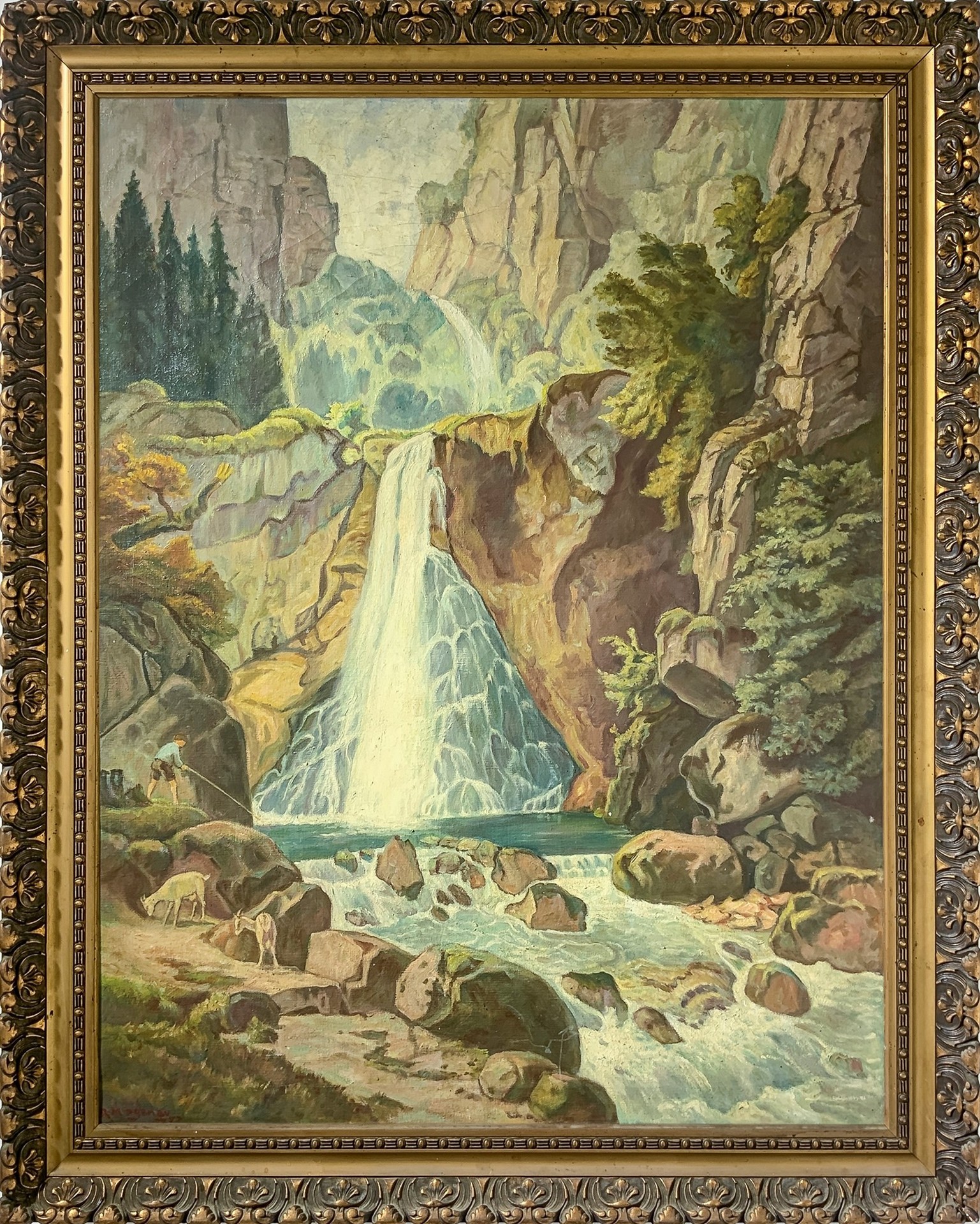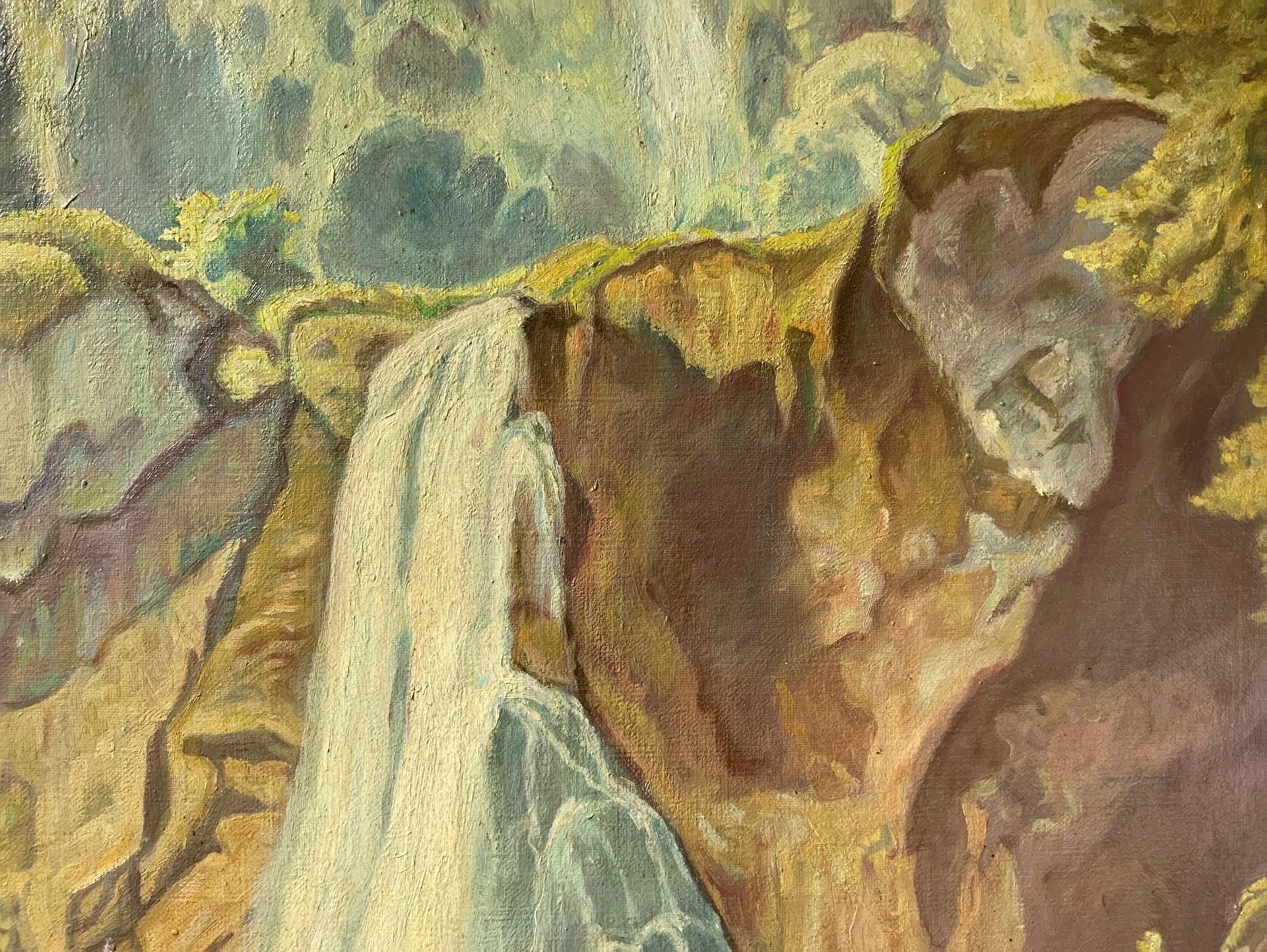 Fiume con cascata d'acqua, Primi 20° secolo Cm 70x80, in cornice cm 110x88 Dipinto ad olio su tela firmato in basso a sinistra R. Magena.