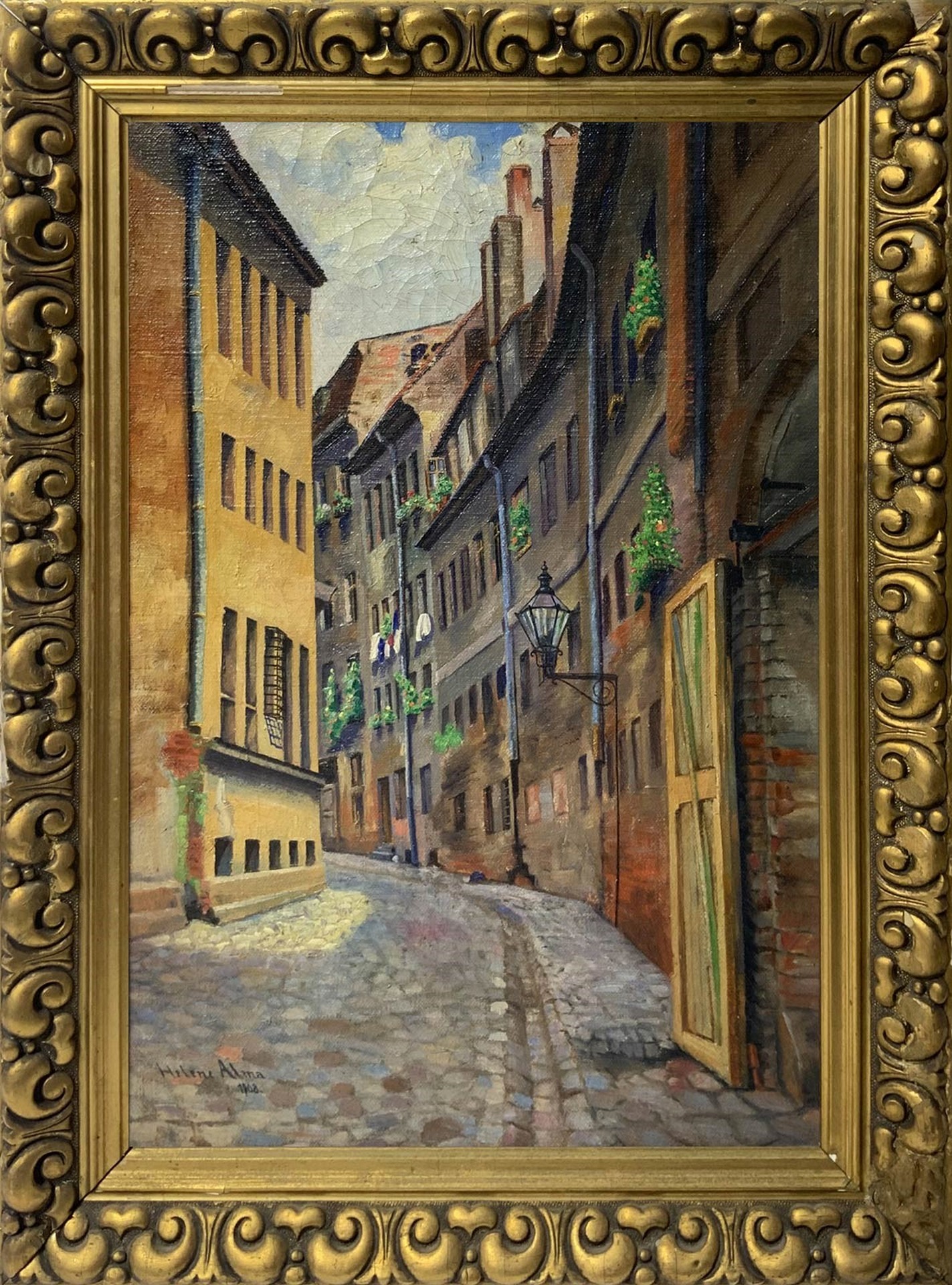 Scorcio di strada fra palazzi, 1908 cm 52x34, in cornice dorata 63x45 cm Dipinto a olio su tela firmato in basso a sinistra Helene Alma e datato 1908.