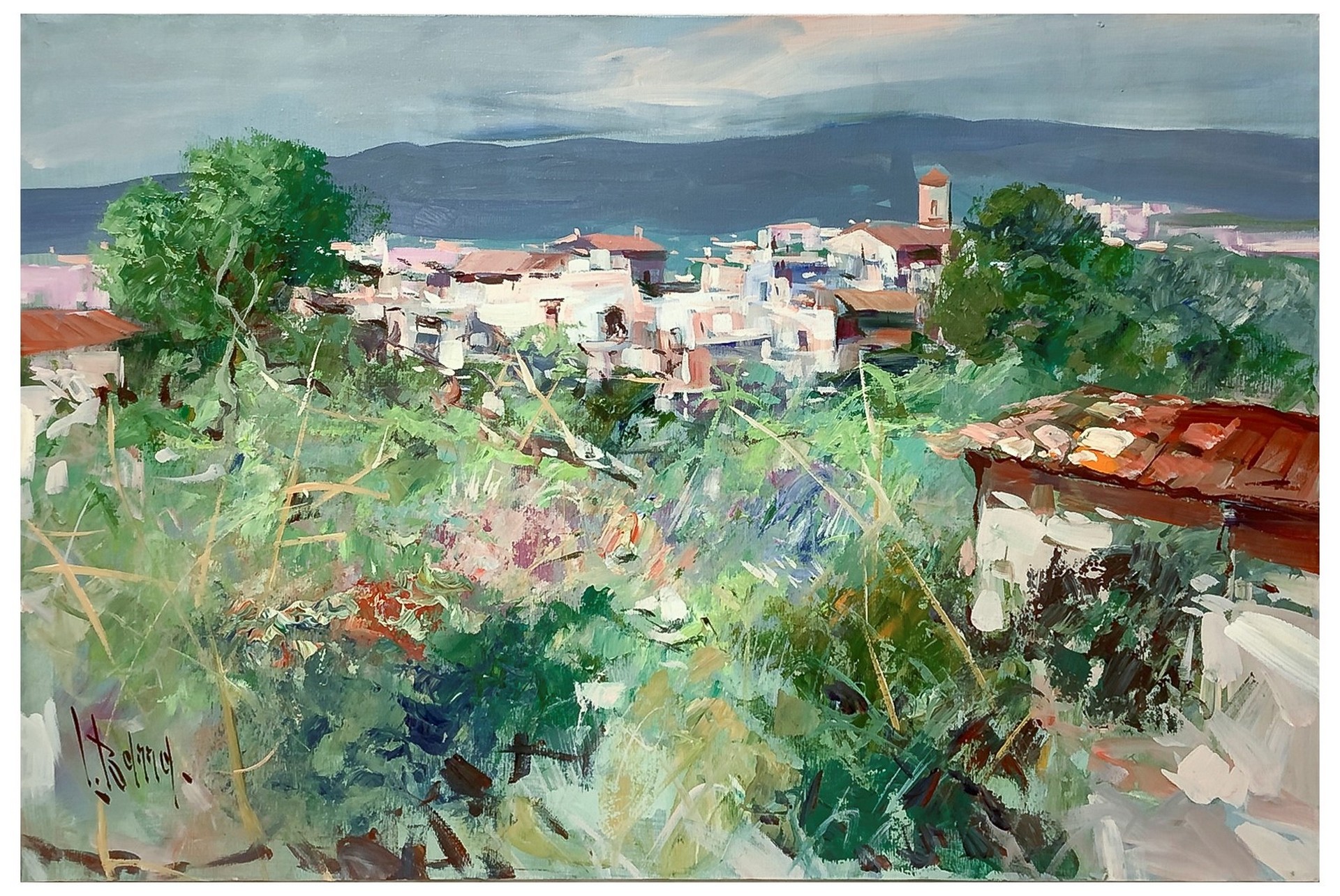 Lelio Barra (Mascalucia) - Scorcio di case con campanile tra gli alberi 40x60 cm Dipinto a olio su tela Opera sprovvista di cornice.