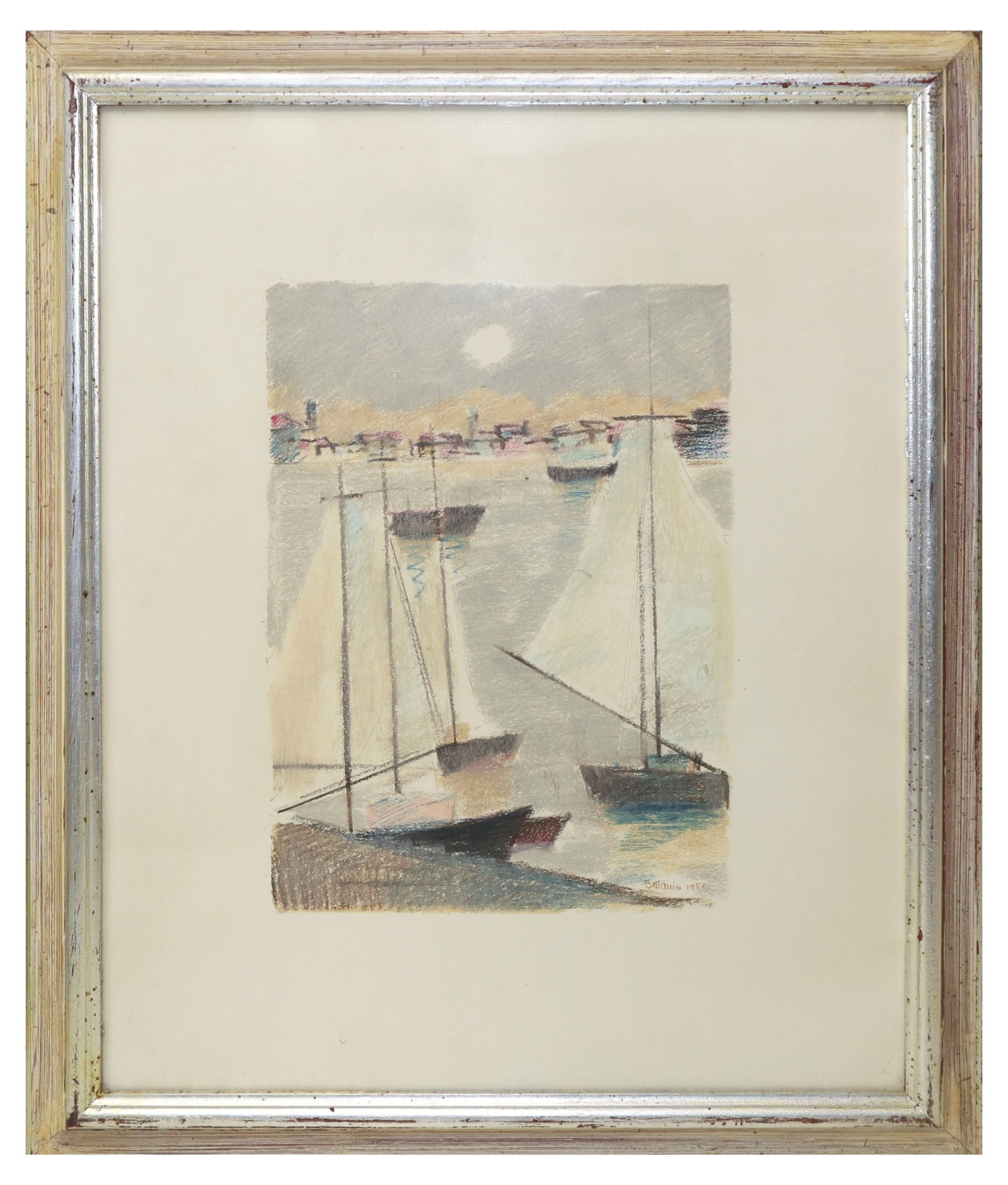 Barche a vela, 1986 cm in cornice 63x54 Pastello su cartone Firmato in basso a destra.
