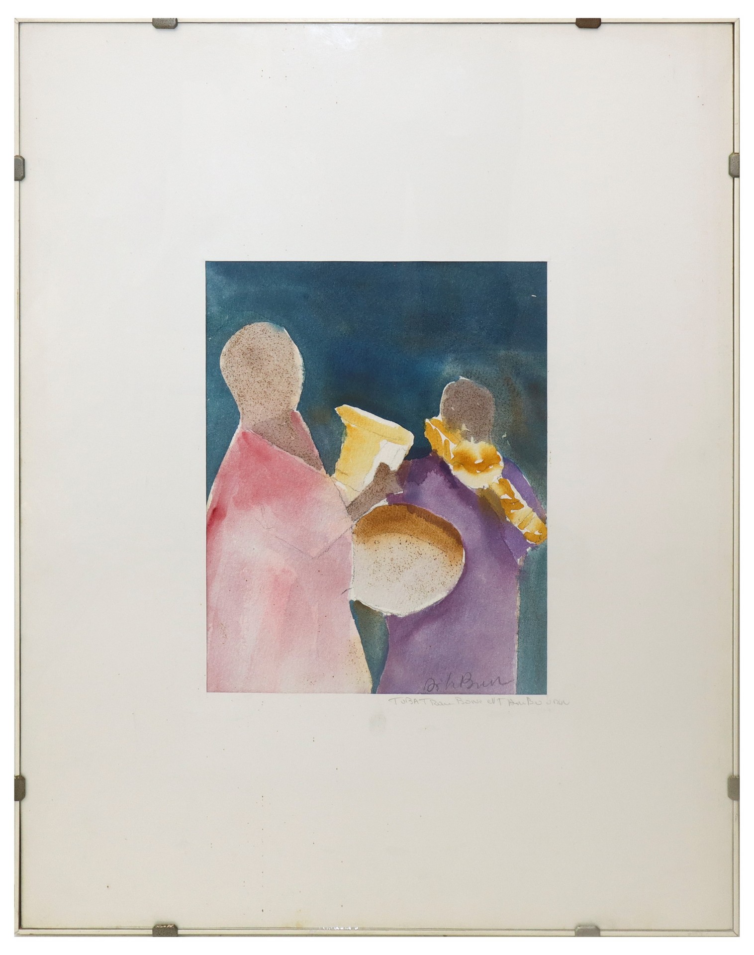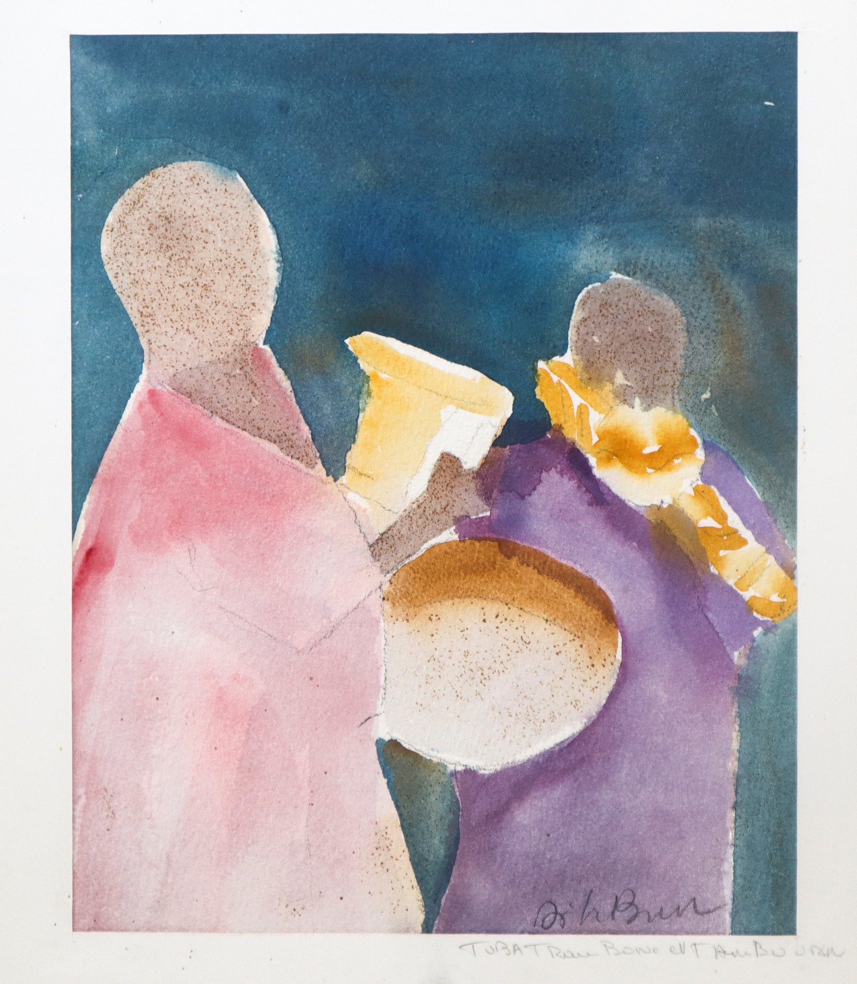 Coppia di figure con trombone cm 30 x 24, in cornice 65 x 50 Acquerello su cartoncino Firmato in basso a destra.
