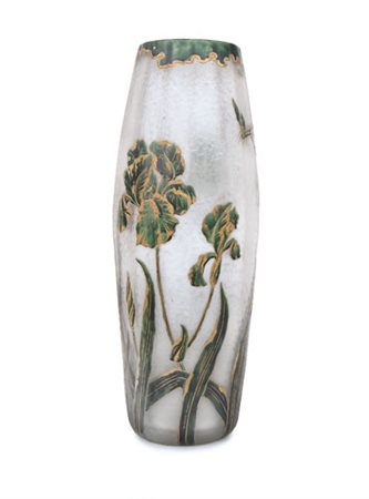 VASO IN VETRO DOPPIO DECORATO A SMALTI E ORO, LEGRAS, MONTJOYE, 1925 CA., ovoidale, decoro a iris, foglie e libellule verdi incisi ad acido ripresi in oro su fondo givré; non firmato.