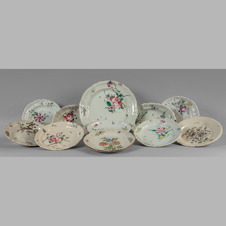 Undici piatti e vassoietti diversi in ceramica decorata a fiori su fondo bianco Lodi e Bassano sec.XVIII