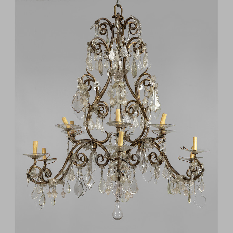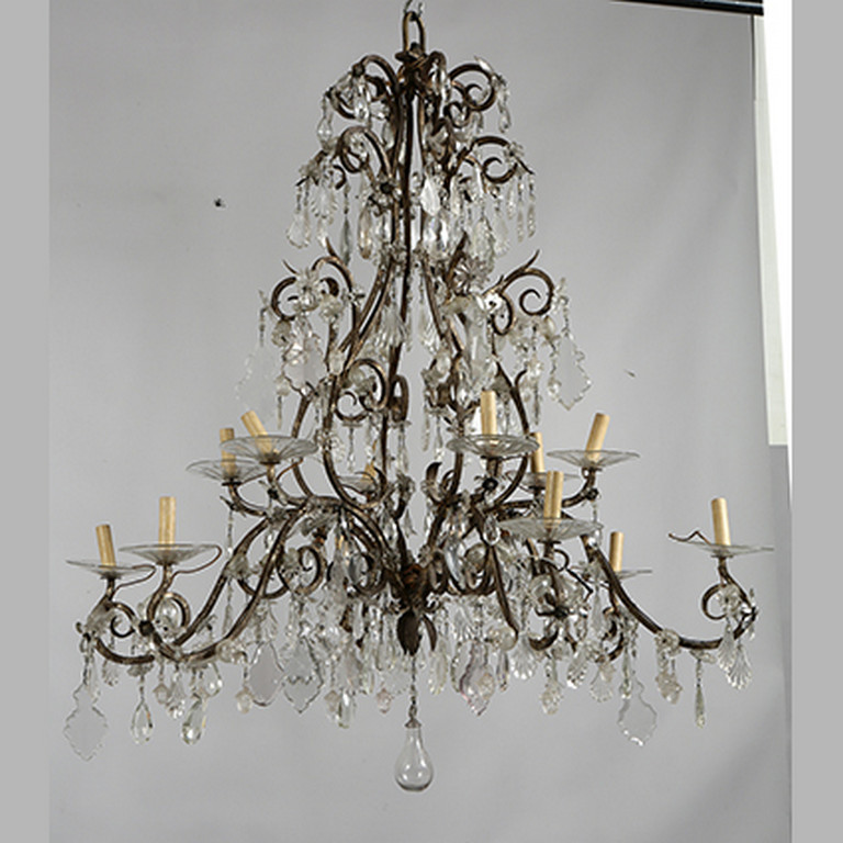 Lampadario in bronzo a dodici luci disposte su due ordini ricca decorazione in cristallo