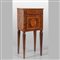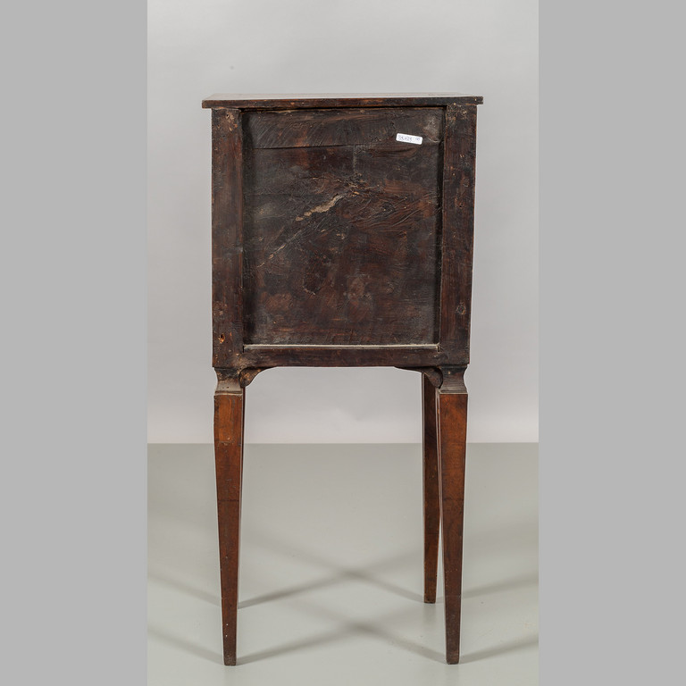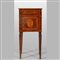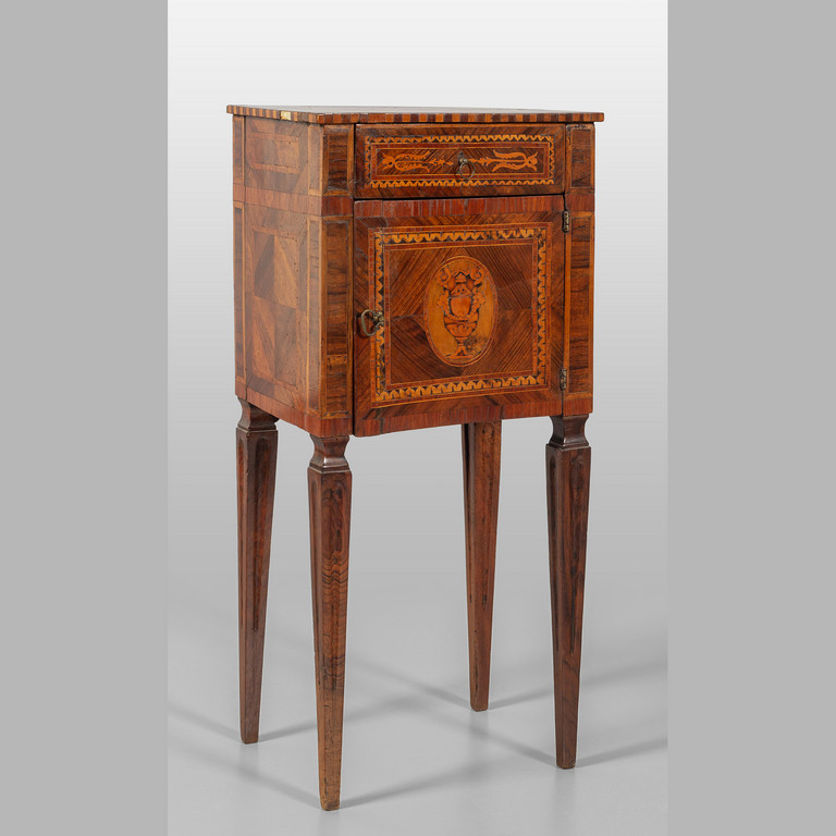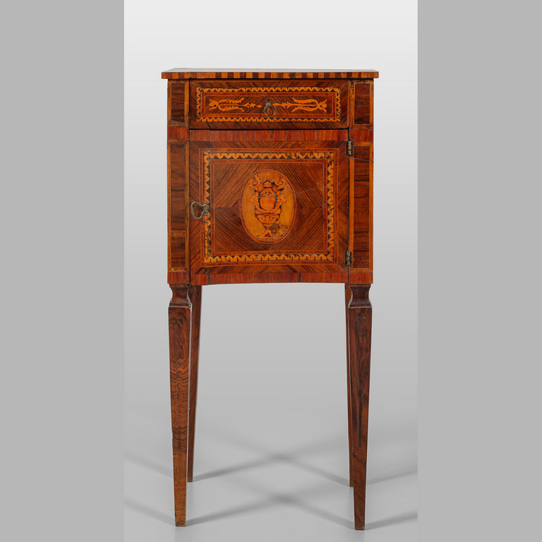 Comodino Luigi XVI in legno finemente lastronato ed intarsiato in legni vari con medaglione centrale un cassetto ed uno sportello sul fronte Lombardia fine sec.XVIII