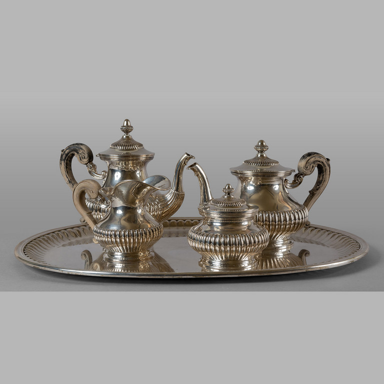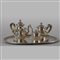 Servizio di thè in argento composto da vassoio e 4 pezzi da portata con manici in legno