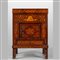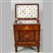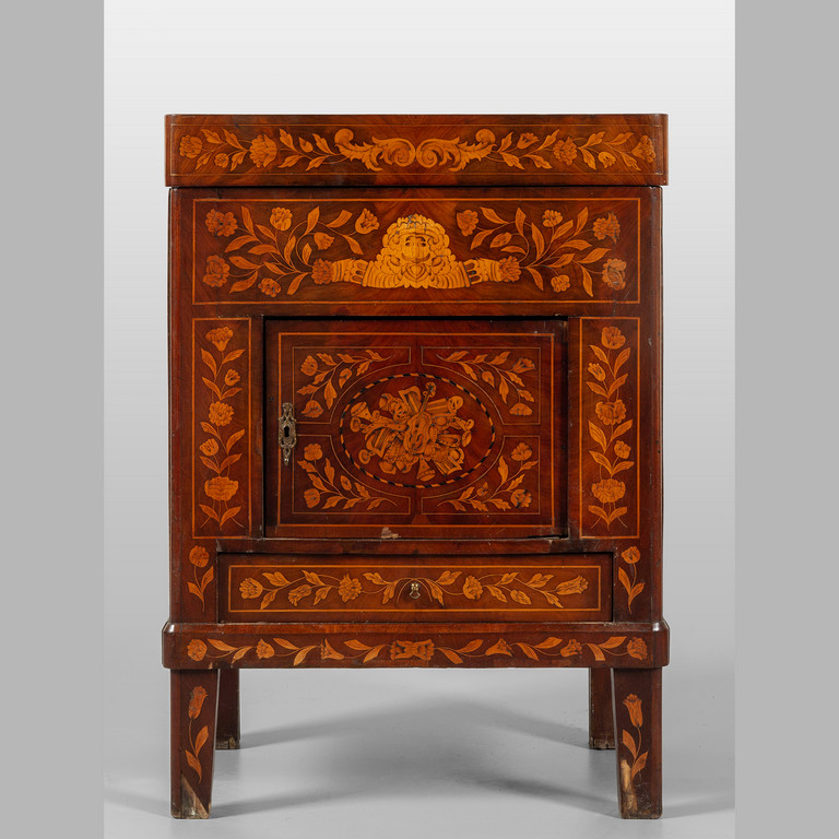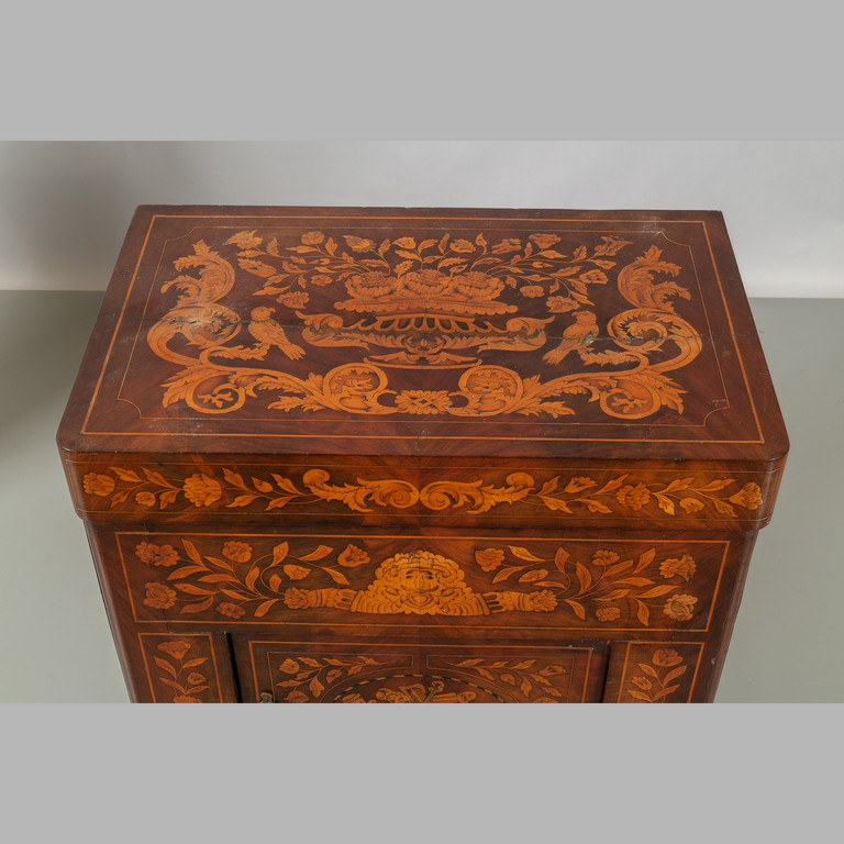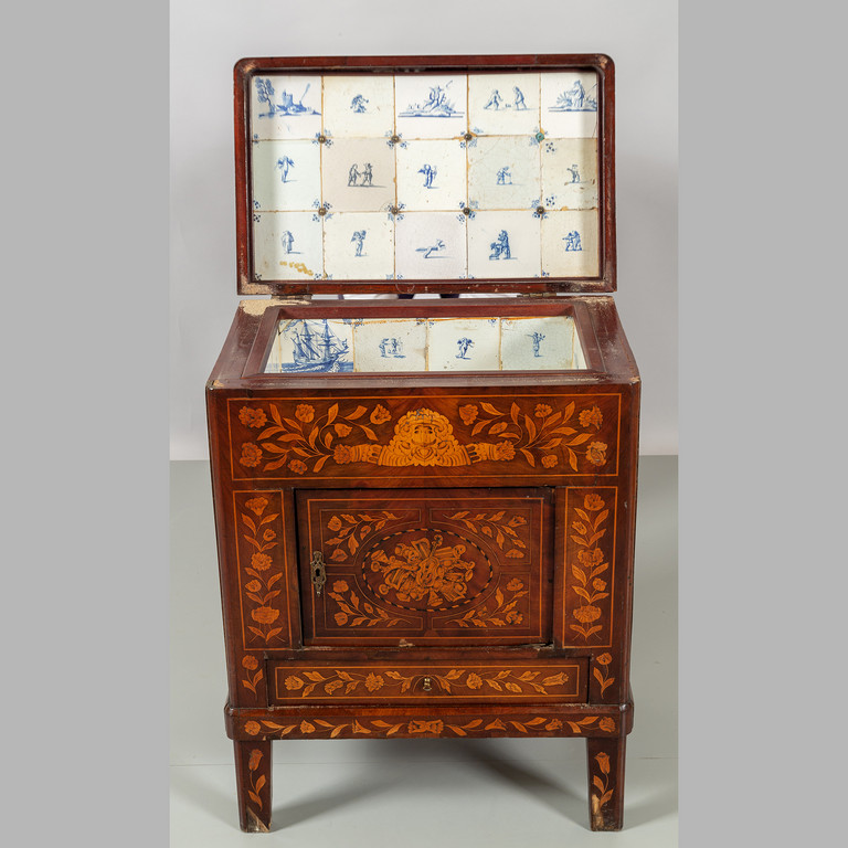 Curioso mobile di servizio in legno lastronato ed intarsiato uno sportello ed un cassetto sul fronte parte superiore ribaltabile decorata all'interno con piastrelle in ceramica di Delft Olanda II metà sec.XVIII