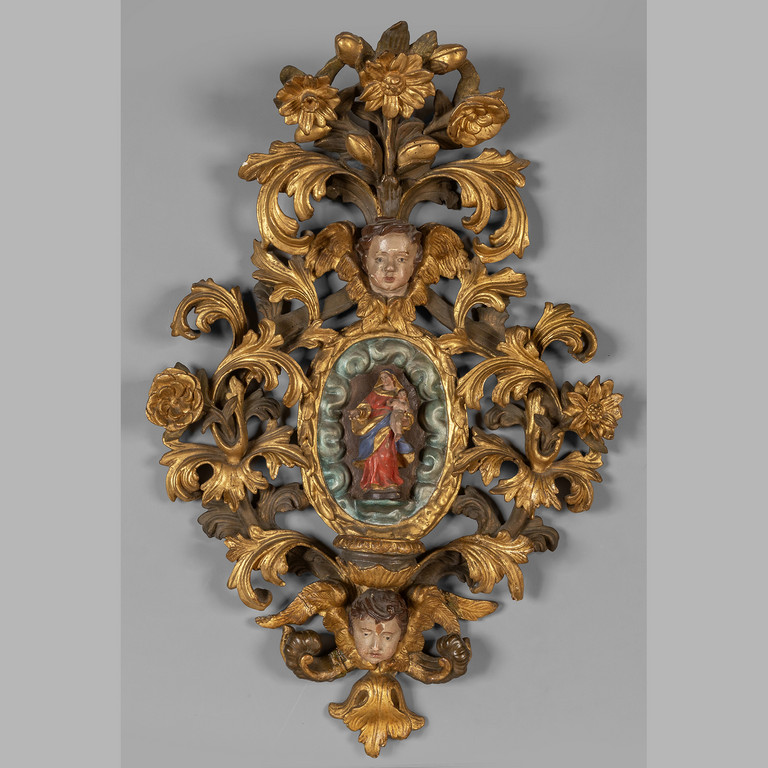 Grande acquasantiera in legno finemente intagliato dorato e policromato Italia Meridionale sec.XVIII