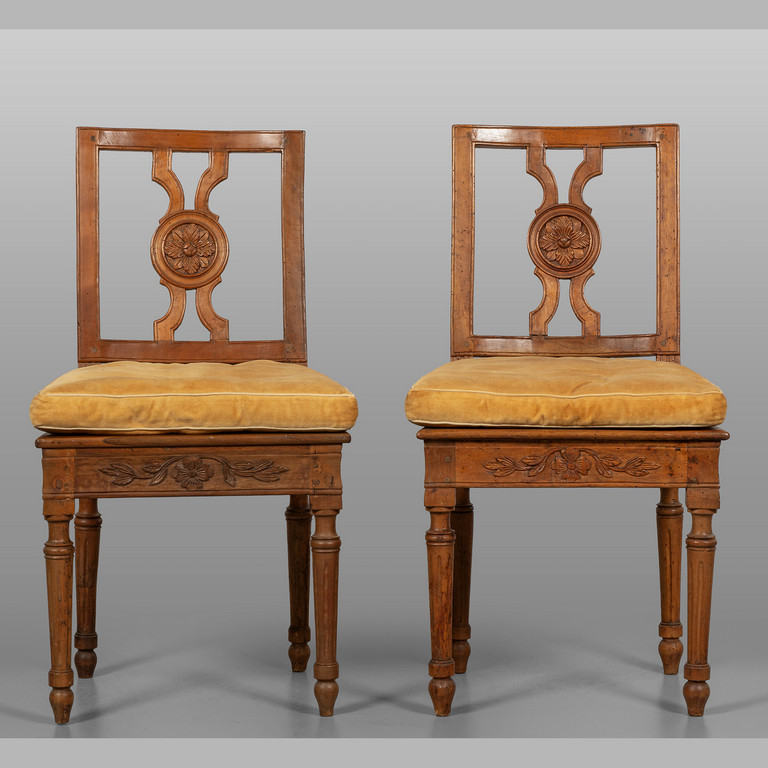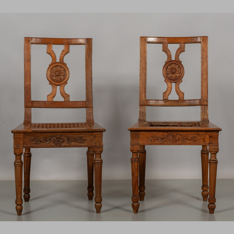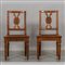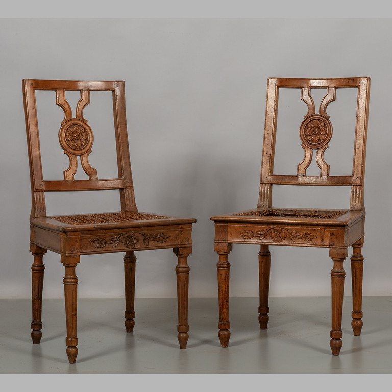 Coppia di sedie Luigi XVI in noce schienale con la stecca a intaglio centrale Piemonte sec.XVIII