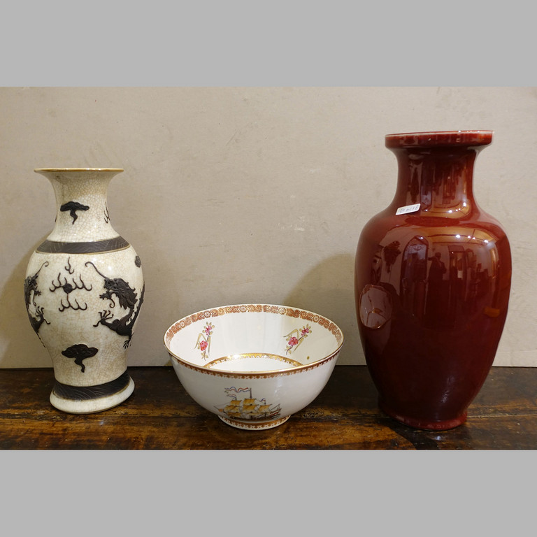 Lotto composto da vaso sangue di bue vaso bianco con dragone e coppa in porcellana con velieri