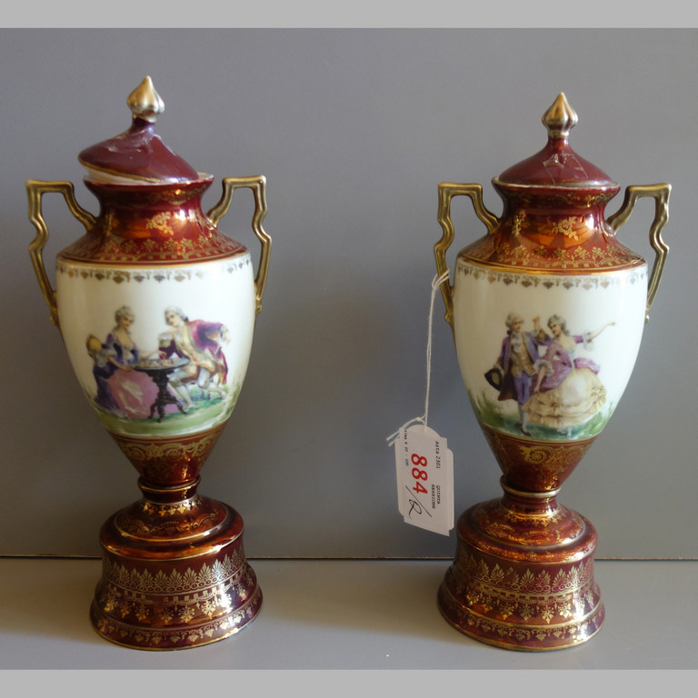 Coppia di anfore in porcellana decorate in policromia con figure settecentesche Vienna fine sec.XIX