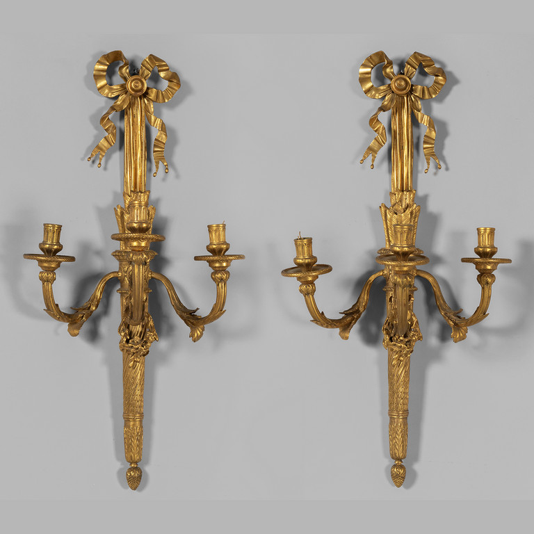 Coppia di grandi apliques a tre luci in bronzo dorato Francia inizi sec.XX