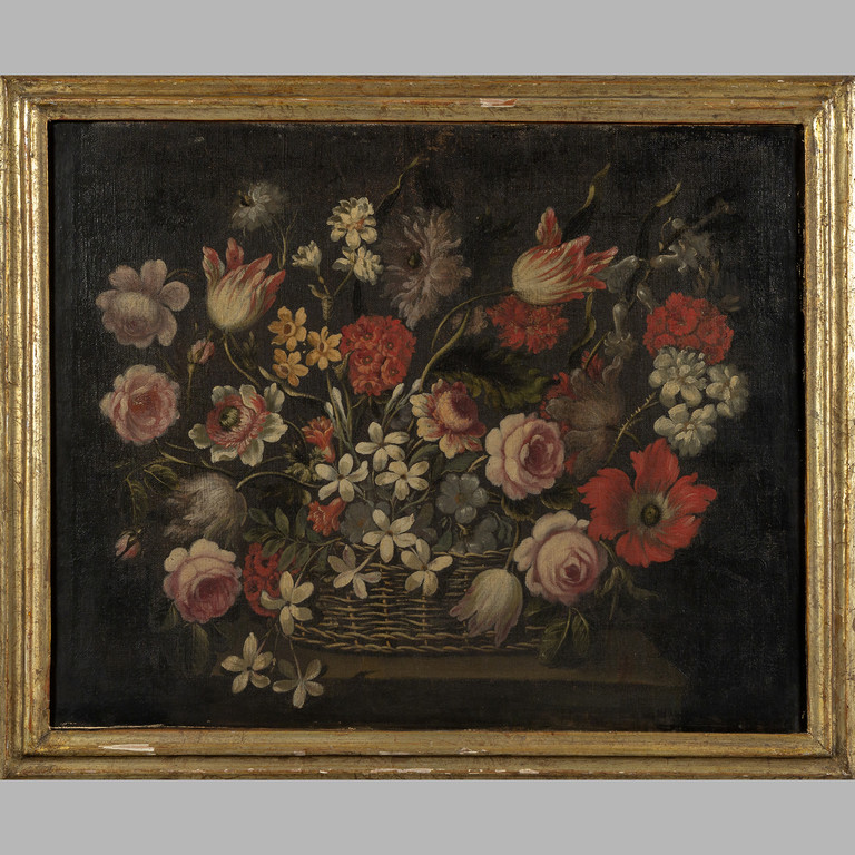 Scuola piemontese sec.XVII 'Fiori' coppia di olii cornici coeve in legno intagliato e dorato