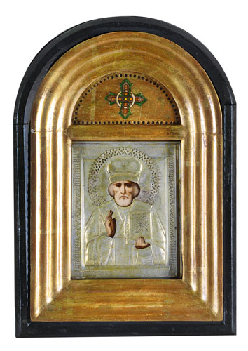 ICONA RUSSA DEL XIX SECOLO San NicolaTempera all'uovo su tavola con riza in...