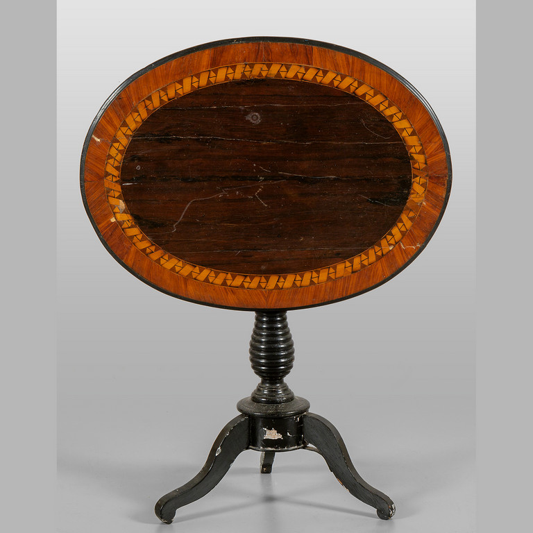 Tavolino ovale con piano a vela lastronato in palissandro e legni vari sec.XIX