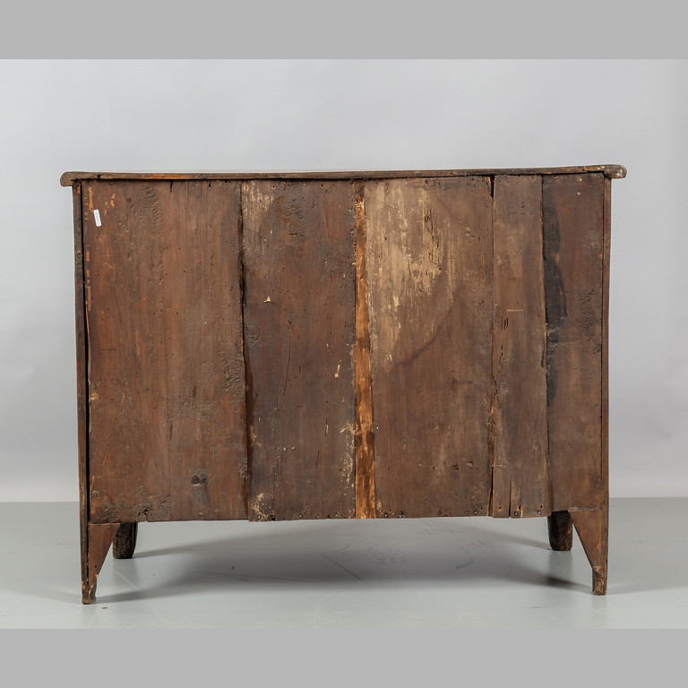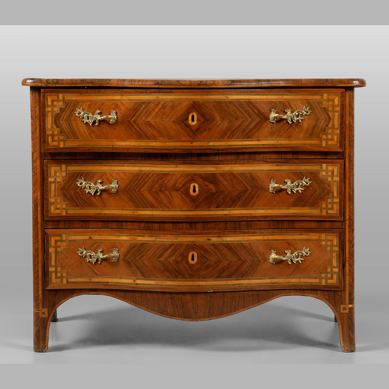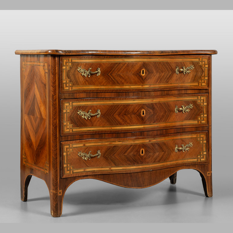 Comò transizione Luigi XV-Luigi XVI a tre cassetti lastronato ed intarsiato anche sul piano in palissandro e legni vari Piemonte II metà sec.XVIII