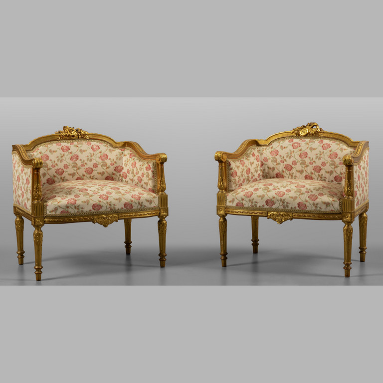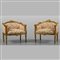 Coppia di grandi poltrone a pozzetto in legno intagliato e dorato cimasa con strumenti musicali inizi sec.XX