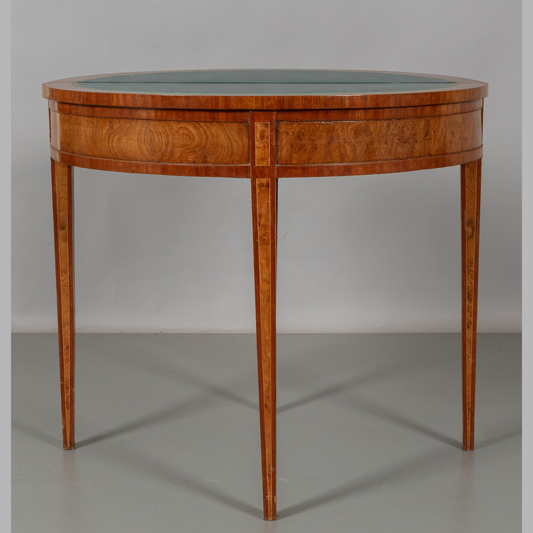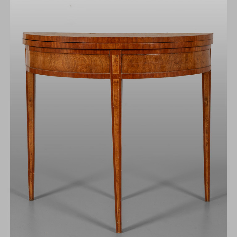 Tavolo a mezza luna apribile impiallacciato in radica di tuja sec.XX