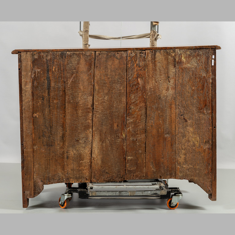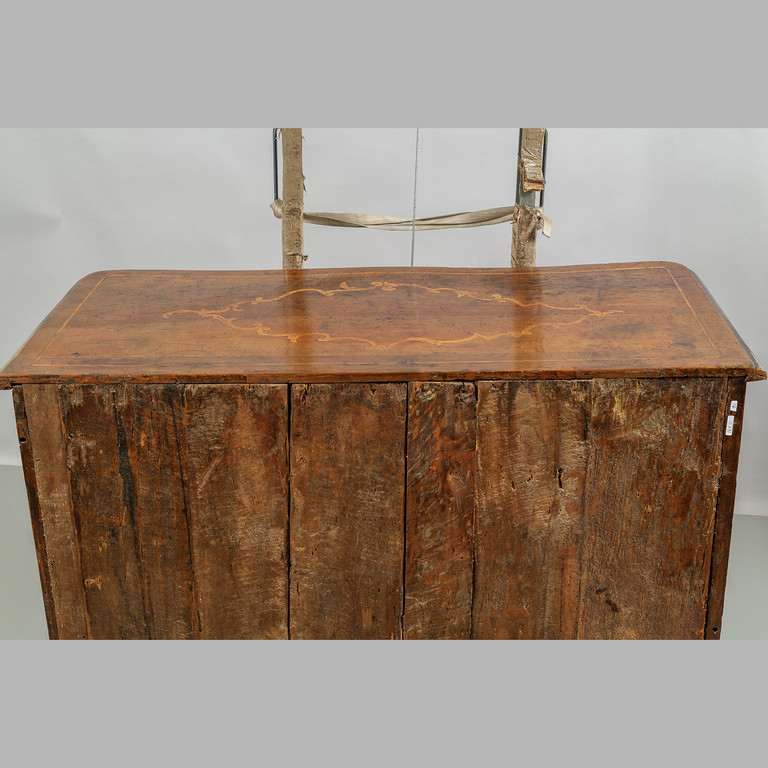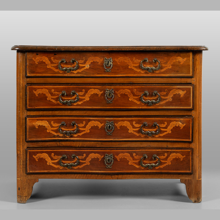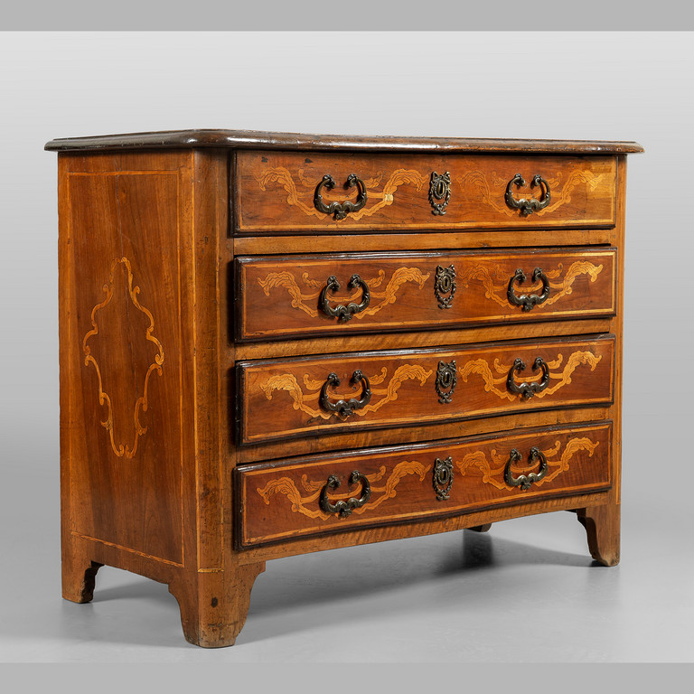 Comò Luigi XIV in noce intarsiato in bois de rose quattro cassetti movimentato sul fronte Piemonte metà sec.XVIII