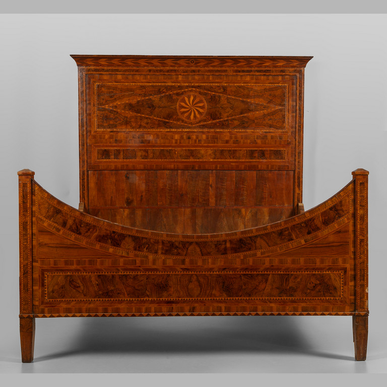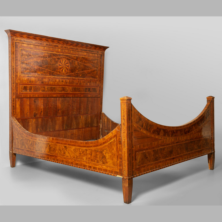 Importante letto matrimoniale in legno finemente intarsiato in radica e legni vari Lombardia II metà sec. XVIII